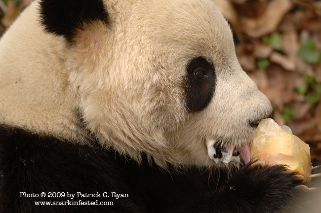 [Tai Shan is eating a block of frozen juice with chunks of apples inside.]