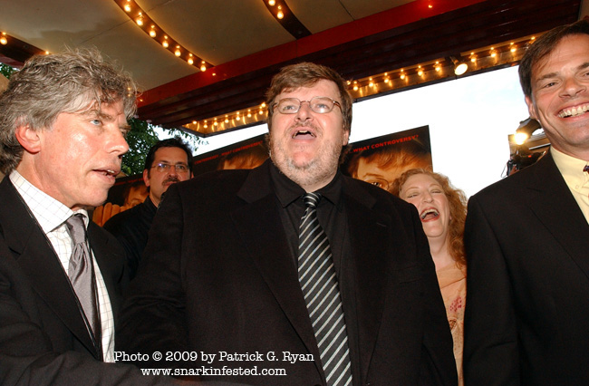 [Director Michael Moore at the Fahrenheit 09/11 premiere in ’04. The faces in this frame remind me of a Hieronymus Bosch painting.]