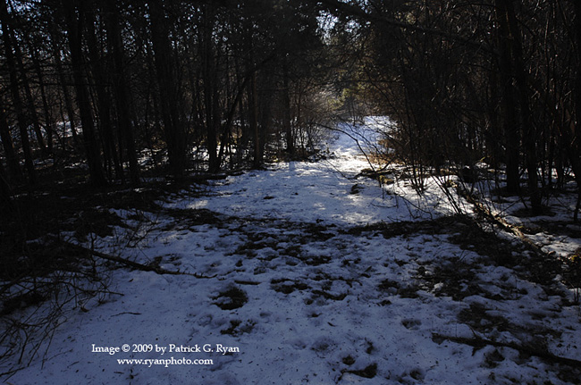 02/16/09 Deer path crossing the dirt road up to the fields on Ryan Farm.