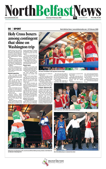 02/07/09 The ref rushes in and ends a fight during the 2nd annual Belfast-Beltway boxing matches at the Westin Hotel ballroom in Washington, DC. The event brings Protestant and Catholic boys who train together in a gym in Belfast to fight boxers from the DC area. Some of my images from this night ran in the North Belfast News . . .