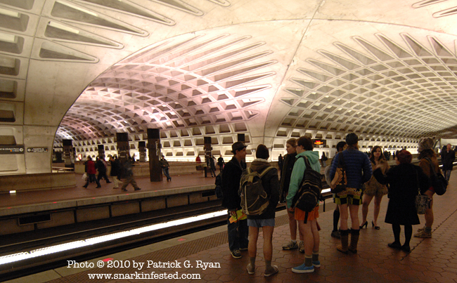 01/10/10 Did you miss it? It sneaks up on us every year. Today was the day to ride the Metro without your pants. Who says DC is stuffy and boring? My rough guess is that over 100 people showed up at the pre-game briefing before descending into the L’Enfant Plaza Metro station to drop trow. I wonder how many participants could hear their mother in the back of their minds saying “If everybody jumped off a cliff would you?” Or how many were attempting to overcome that anxiety dream. You know, the one where they show up to work or church in their briefs.