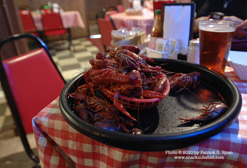 [Crawdads and Abita beer at Frankie & Johnny’s.]