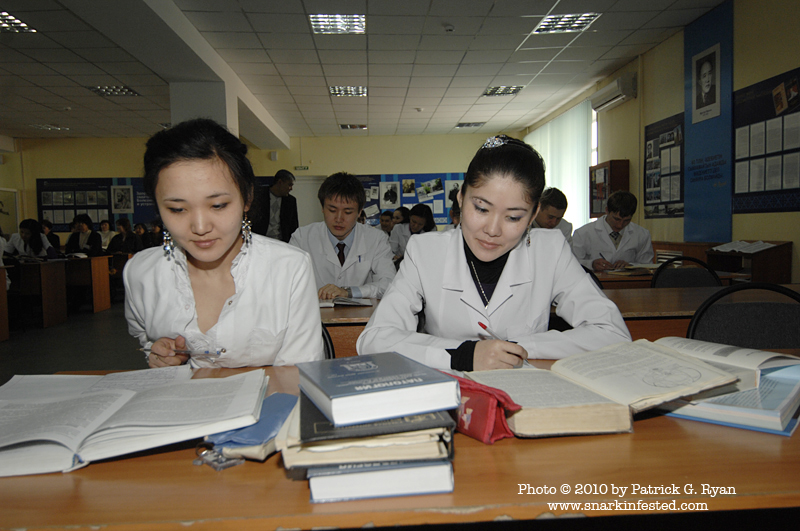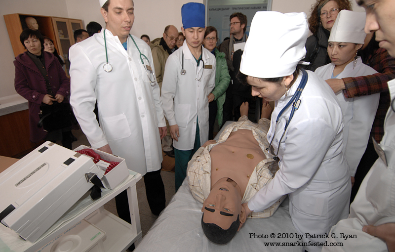 04/05/10 I took a tour of the medical university in Semipalantinsk which is like any med school but because of its proximity to the nuke test site makes a special study on the effects of radiation. As you enter the college you can’t help but notice a large cabinet filled with embryos of babies with birth defects. I’m including 2 images of them here not to be sensational but to show how terribly the people of the region suffered.
