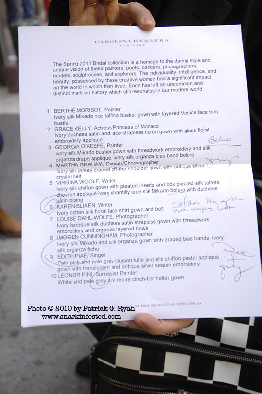04/12/2010 Herrera Run Of Show 04/11/10 I had a couple emailed questions about yesterday’s photos from the Carolina Herrera show. I asked a fashion reporter to show me her notes on the official run-of-show release and here they are. Hopefully this explains everything . . . Share this: Click to share on Facebook (Opens in new window) Facebook Click to share on X (Opens in new window) X Like Loading... Related