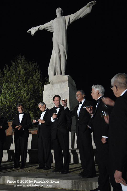 04/15/10 The Men’s Titanic Society toast the courage of the men aboard the doomed liner Titanic who willingly responded to the call of “women and children first!” and went down with the ship. This is the 32nd year the Society has marked the anniversary of the 1912 sinking. They gather at the Titanic Memorial – a hidden jewel of outdoor Washington sculpture – located at 4th and P Streets SW at 12:30a.m. which marks the time the ship broke apart and sank after hitting an iceberg.