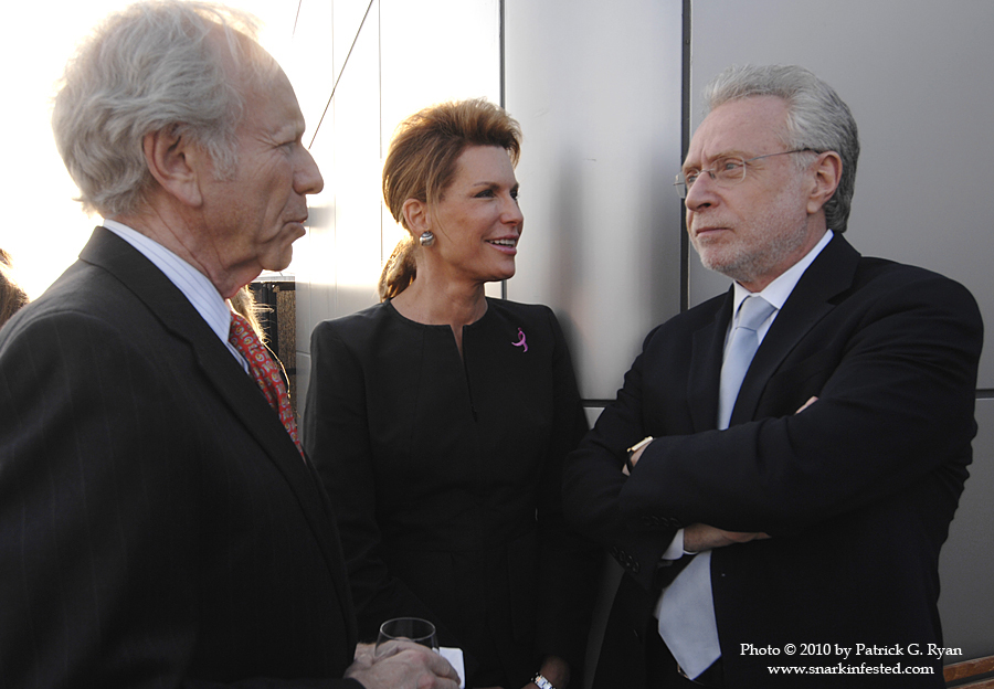 [Senator Joe Lieberman, Ambassador Nancy Brinker and CNN’s Wolf Blitzer chatting at the cocktail reception on the roof of the Newseum.]