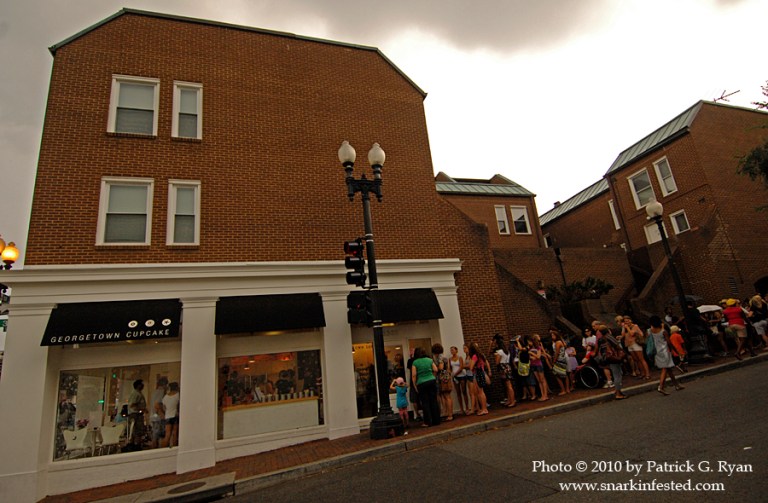 Today I walked by Georgetown Cupcake hq and saw a line of people humbly STANDING IN THE RAIN to purchase a product indistinguishable from that which they could buy for much less at a local grocery store.