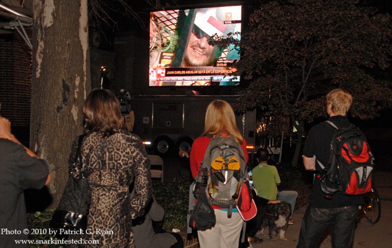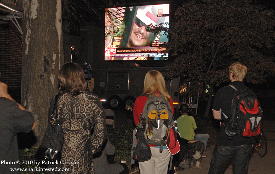 10/14/2010 Live From Chile 10/13/10 People on their way home from work in the early evening stop to watch the rescue of the trapped mine workers from a TV set up in front of the Embassy of Chile on Massachusetts Ave. in DC. Share this: Click to share on Facebook (Opens in new window) Facebook Click to share on X (Opens in new window) X Like Loading... Related