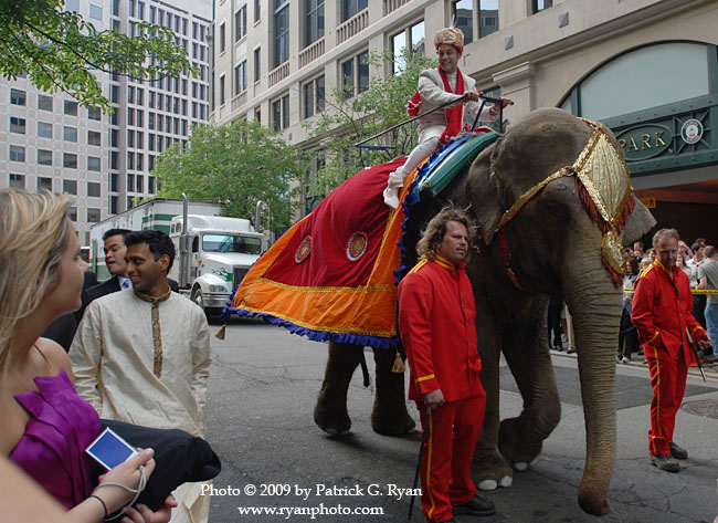 [Groom arrives on elephant at Mayflower Hotel.]