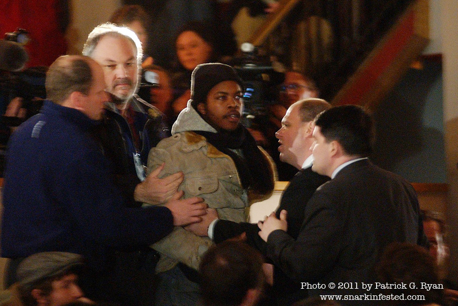 [A heckler supporting Lyndon LaRouche is ejected from a Howard Dean town hall meeting in Manchester, NH in 2004.]