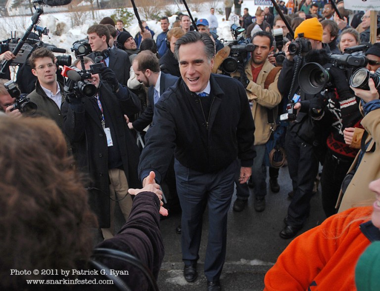 [Presidential hopeful Mitt Romney greets voters at Broad Street Elementary School in Nashua, NH on Primary Day 2008.]