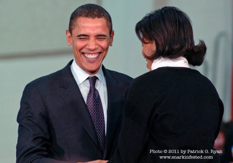 [Senator Barack Obama (D IL) laughs with his wife after she introduces him at a late night rally on the eve of Primary Day in the gym of the Concord High School in Concord, NH. He lost the ’08 Primary the next day to Senator Hillary Clinton (D NY)]