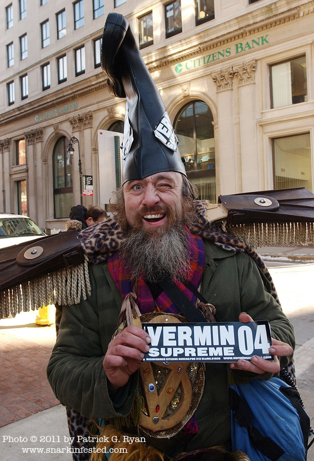 [Vermin Supreme seeks votes on the streets of Manchester on NH Primary Day 2004.]