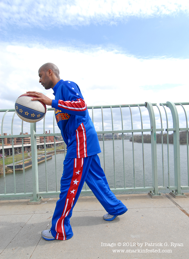 03/19/12 Harlem Globetrotter “Flight Time” Lang arrives in Washington D.C. in unique style – dribbling and spinning basketballs across the Francis Scott Key Bridge.