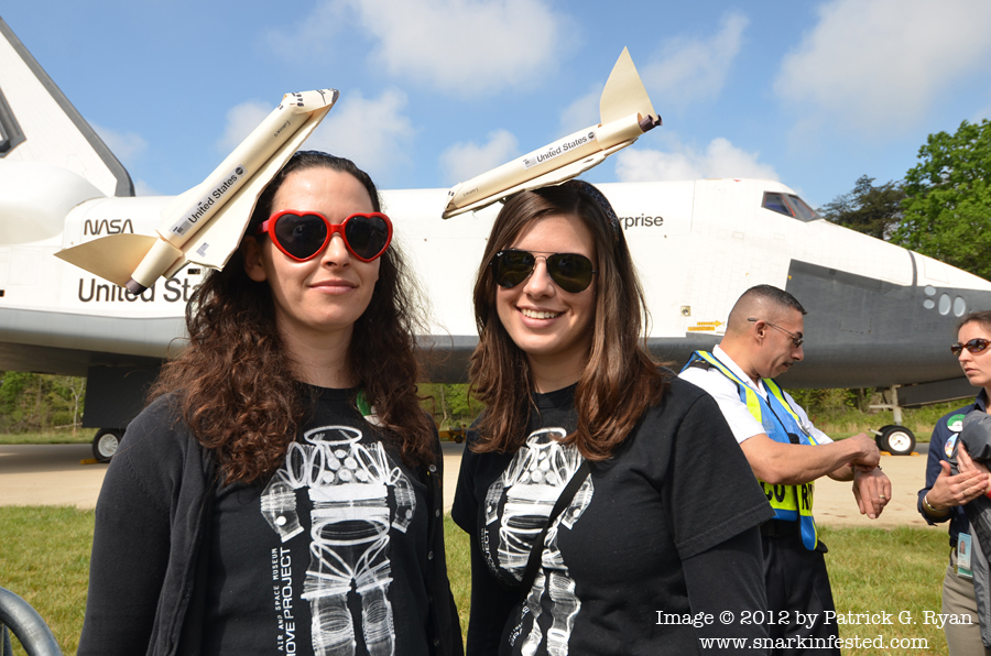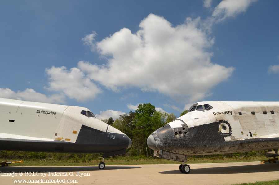 [Enterprise (which never went into space) on the left looks new compared to the hull of Discovery which has been charred by re-entry.]