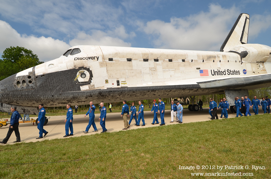 [Former commanders of the space shuttle walk along beside Discovery as it is moved into position for the ceremony.]