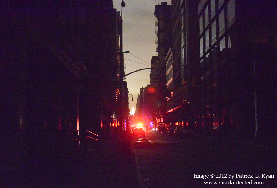 11/02/2012 Lights Out 10/30/12 Walking down Mercer Street in Soho on Tuesday night after the power had been out for 24 hours due to Hurricane Sandy. That’s the Chrysler Building lit up in the distance. Share this: Click to share on Facebook (Opens in new window) Facebook Click to share on X (Opens in new window) X Like Loading... Related