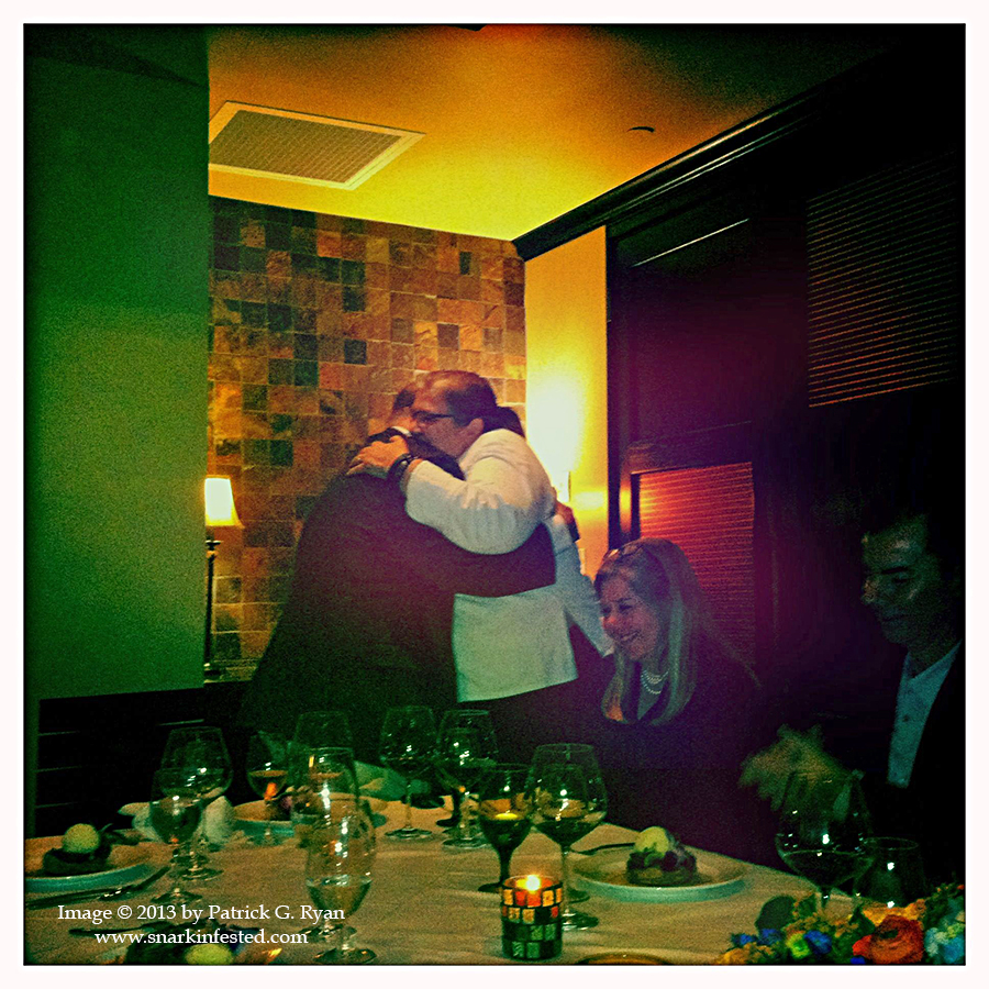 10/19/13 Bob Juliano hugs his friend, famed chef Ris Lacoste, at the conclusion of his multi-course birthday dinner at her restaurant, RIS.