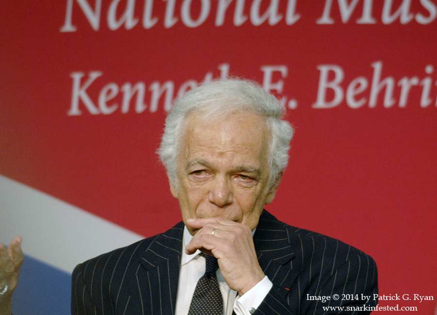 06/17/14 American fashion designer Ralph Lauren weeps after being awarded The James Smithson Bicentennial Medal at the Smithsonian’s National Museum of American History on Tuesday morning. The medal was presented by Hillary Clinton who credits Lauren’s $10 million contribution to the Smithsonian with helping preserve and restore “The Star Spangled Banner” – the flag which flew over Ft. McHenry during the War of 1812 and inspired our national anthem.