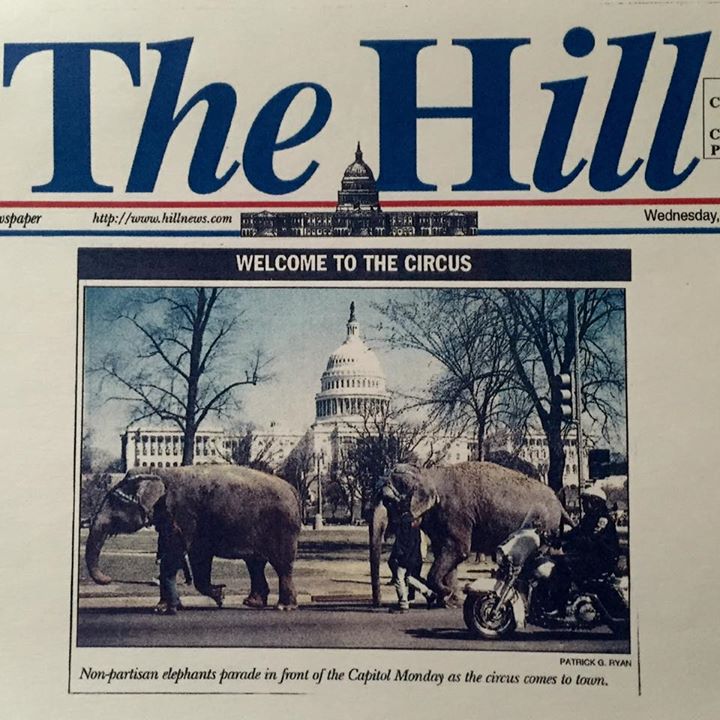 [2001 Elephant Walk – I shot while Staff Photographer at The Hill Newspaper. The caption reads “Non-partisan elephants parade in front of the Capitol Monday as the circus came to town.”]